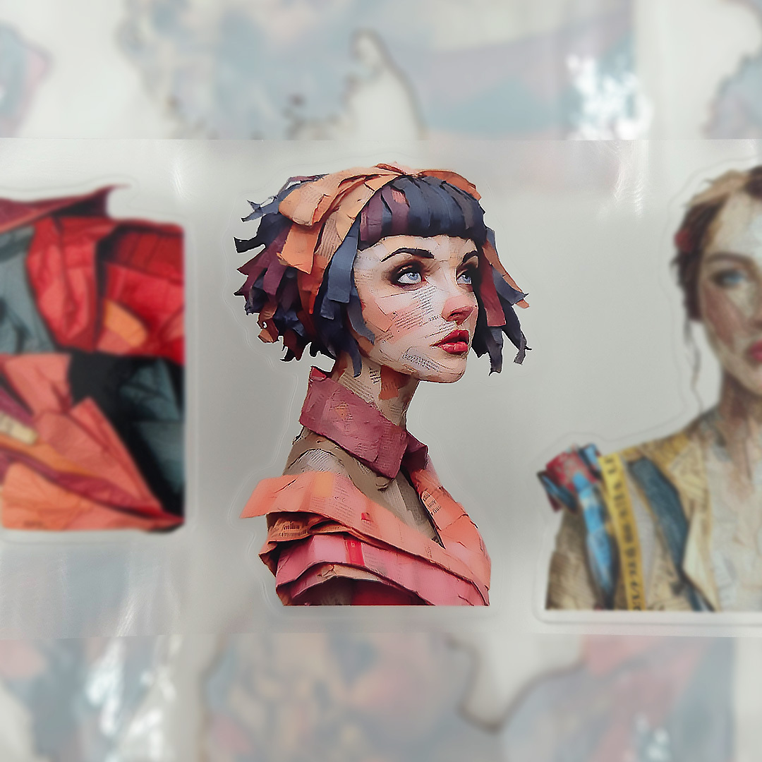 One loop of PET-tape with release paper. Kiss-cut 3D embossed glossy illustrations on matte background.